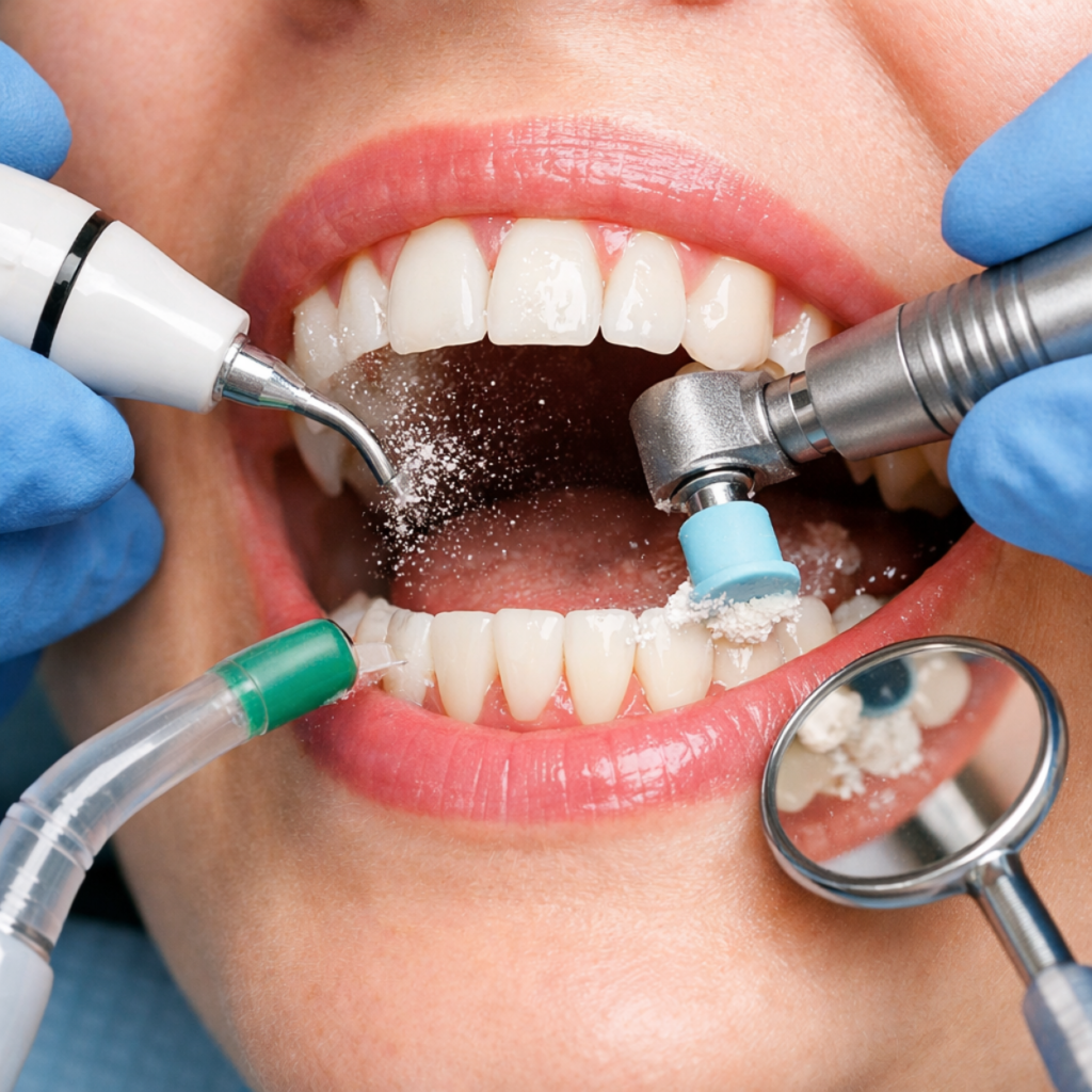 Professional teeth cleaning removes plaque, tartar, and surface stains that accumulate despite regular brushing and flossing. This procedure helps prevent gum disease, tooth decay, and bad breath. Polishing smoothens the tooth surface, making it harder for plaque to adhere and giving teeth a clean, refreshed appearance. Regular cleaning is essential for maintaining healthy gums and long-term oral hygiene.