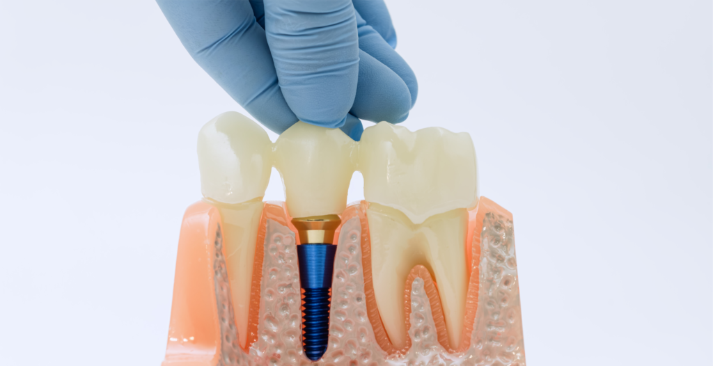 Dental implants are a permanent and reliable solution for missing teeth. A titanium implant is placed into the jawbone, where it integrates naturally with the bone to form a strong foundation. Implants support crowns, bridges, or dentures, restoring chewing function, preventing bone loss, and providing a natural appearance and long-term durability.